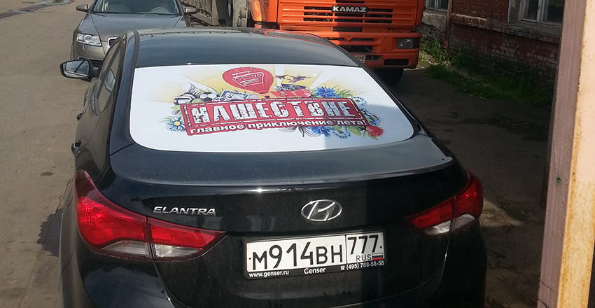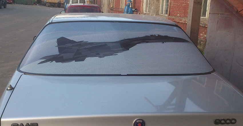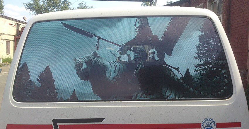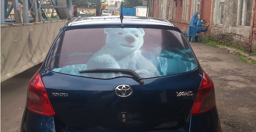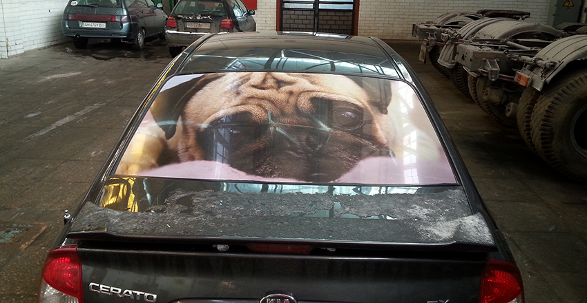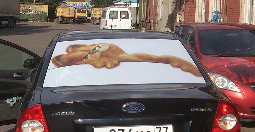 Печать на перфорированной плёнке служит хорошим инструментом выделения автомобиля из общего потока. Снаружи плёнка препятствует попаданию света, а изнутри предоставляет полноценный обзор, придавая эффект лёгкой тонировки. Наклейки выполненые из перфорированной пленки, используют на автомобили, автобусы, пассажирский транспорт, офисные здания и в интерьере.